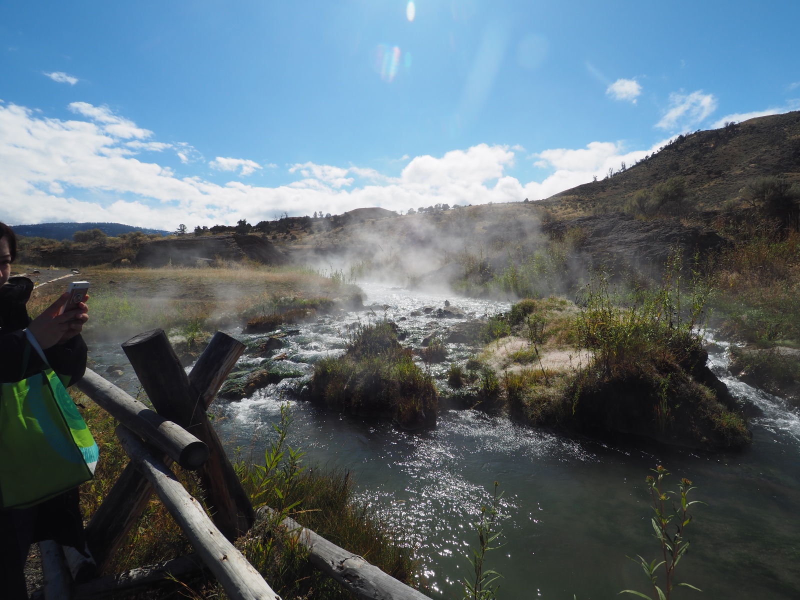 その後、出口方面のYellowstone温泉を目指す。一気に標高が下がって、気温も結構上がってきた。