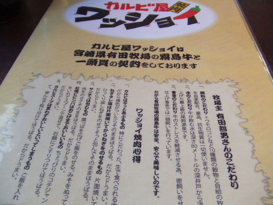 アリが焼き肉食わないと気がすまないとか言い出したので近所の"焼肉カルビ屋ワッショイ"へ。
